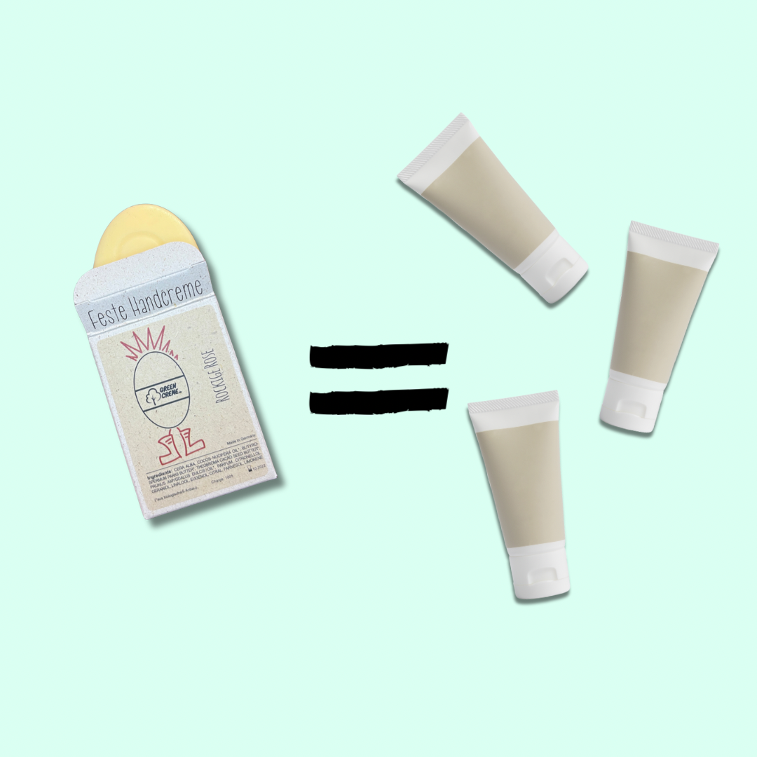 Unsere Produkte kommen gänzlich ohne Wasser, Alkohol und Glycerin aus. Diese Stoffe machen viel Volumen. Wir vereinen die geballte Power von 3 Cremetuben in nur einer GreenCreme.